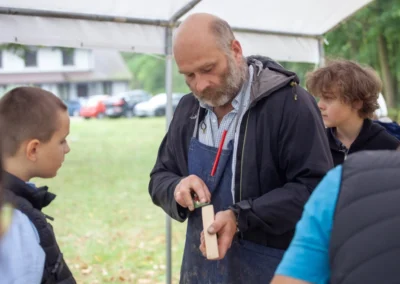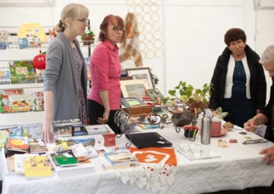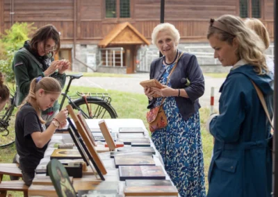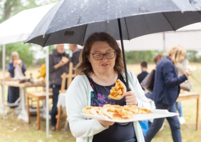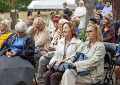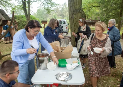 Po części artystycznej uczestnicy pikniku mogli posilić się ciepłym posiłkiem, napić herbaty czy kawy. Schronienie przed deszczem, który wisiał w powietrzu w czasie występu zespołu, zapewniły nam rozstawione dzień wcześniej namioty. Dzięki zaangażowaniu naszych przyjaciół i pobliskich mieszkańców w sobotę poprzedzającą piknik udało się posprzątać ogród (m.in wygrabić spadające już liście), a następnie cieszyć wspólnym uczestnictwem w następujących aktywnościach i atrakcjach: warsztatach plastycznych z Galerią B.S., loterii fantowej, łamigłówkach dla mądrej główki, grze terenowej o Prymasie, quizie wiedzy o Prymasie, warsztacie stolarskim, wystawie akwareli i ikon, miodach z Choszczówki, stoiskach z książkami Wydawnictwa Soli Deo i Civitas Christiana.